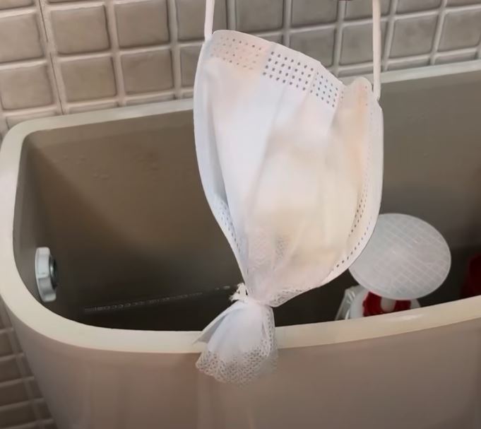 In the clip, two of the balls are placed inside a mask and then set into the toilet tank for use.