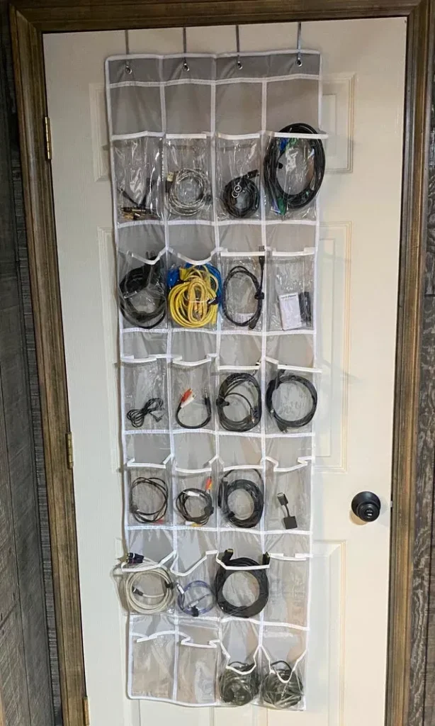 If you are tired of tangled electronic cables, here is a little idea that truly helps. A hanging shoe caddy can hold each one in its own pocket so everything stays neat and easy to find.