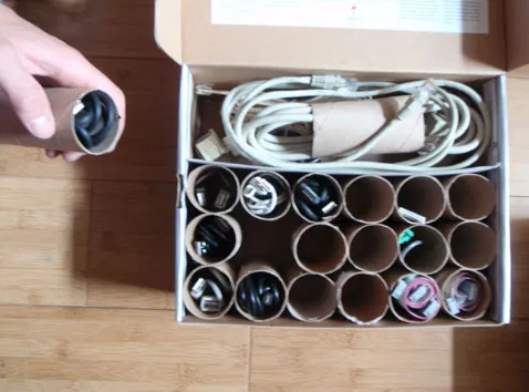 I will admit this storage trick is a little unexpected, but it works so well. You slide each cable into a toilet paper tube and place them all in a box.