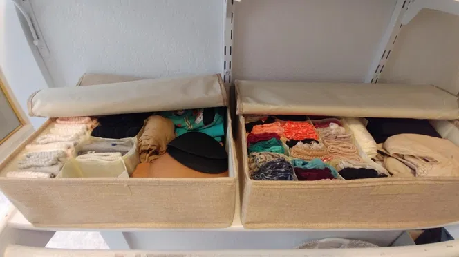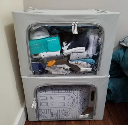 Here is another thoughtful storage idea for clothes or any small items you want to tuck away. These containers fold and stack, so you can use just the right number for your space.