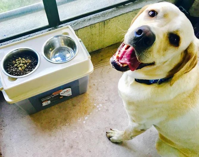 Look at this sweet little pup. He looks so happy, and it is easy to see why. His parents gave him this clever two in one pet feeder, and now he has his own tidy spot for his bowls.