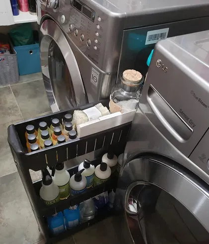 It is amazing how many little corners in a home can turn into useful storage. Here, someone tucked a slim slide out tower between the washer and dryer.