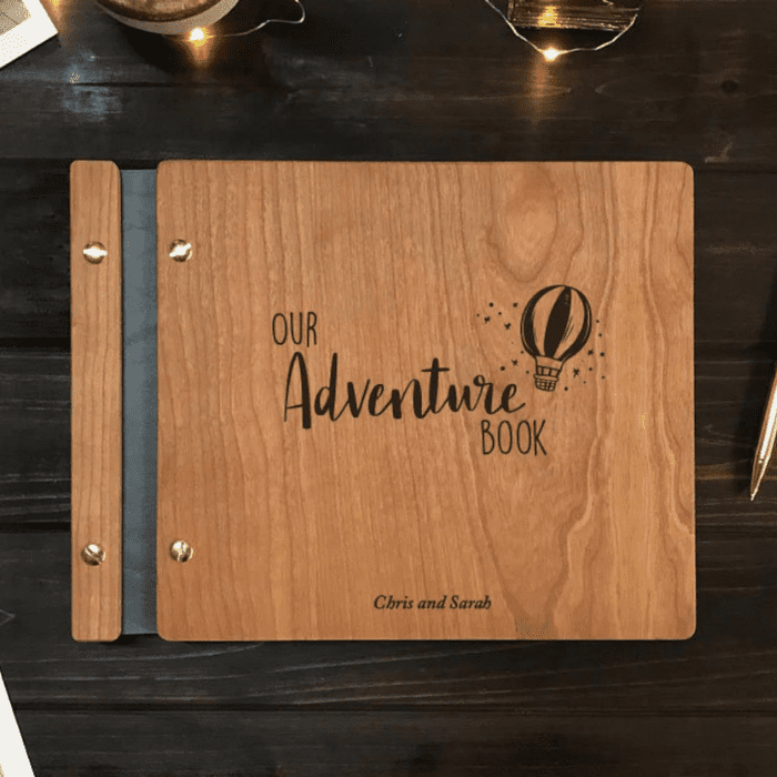 A smooth wooden cover rests quietly, engraved with the words Our Adventure Book.