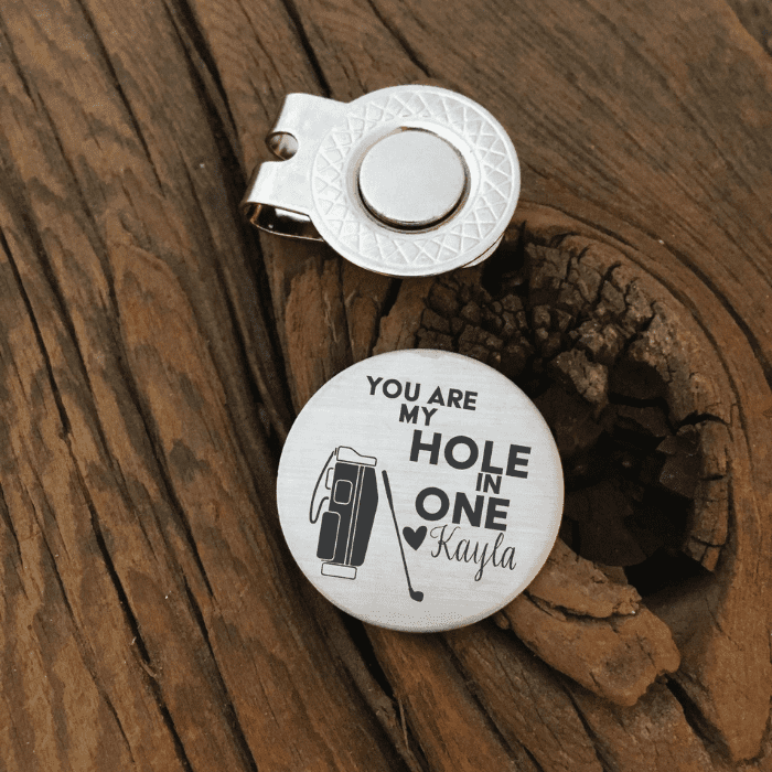 A round metal keepsake rests on warm wood, engraved with the words you are my hole in one.