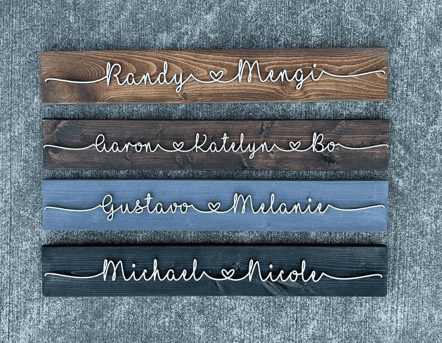 Each piece features a couple’s names in flowing script, gently connected by a small heart.