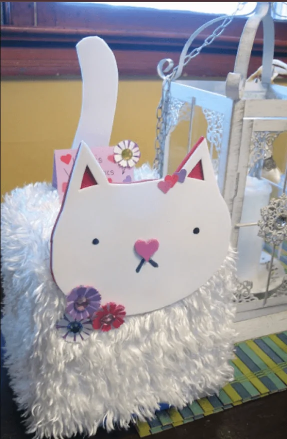 This cat themed Valentine box is soft, sweet, and full of cozy charm. The fluffy texture and simple cat face give it a gentle handmade look that feels extra special. Small heart and flower details add the perfect Valentine touch.