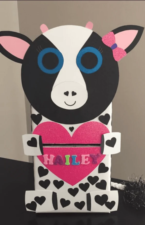 This cow themed Valentine box is sweet, playful, and full of charm. The bold black and white pattern, bright blue eyes, and soft pink accents give it a friendly cartoon look kids love. Little heart details keep it perfectly festive for Valentine’s Day.