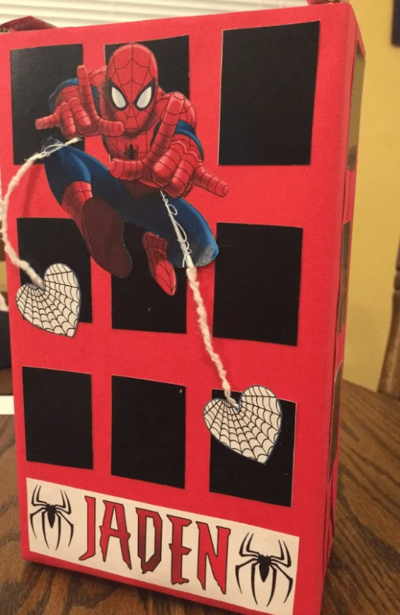 This Spiderman themed Valentine box is bold and full of action. The bright red color, city style windows, and dynamic Spiderman cutout instantly grab attention and feel exciting for superhero fans.
