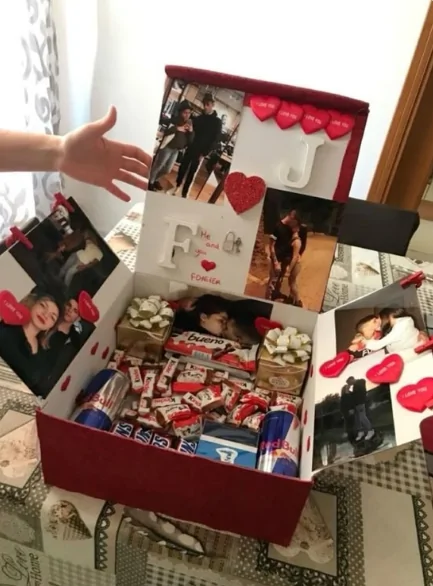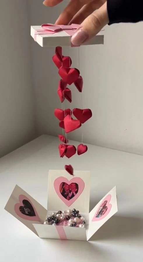 It opens like a surprise you can feel before you fully see it. A deep red box unfolds outward, revealing layers of photos, notes, and tiny heart details tucked into every side. The snapshots feel casual and real, capturing happy moments, while glittery hearts and handwritten-style letters add that unmistakable handmade touch. A hand hovers nearby, mid-gesture, as if saying “wait, look at this.”