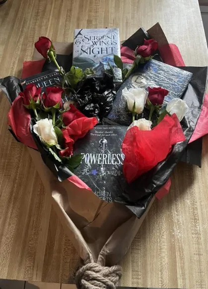 It comes together like a gift that makes a statement before a word is spoken. Wrapped in deep black, red, and warm brown paper, the bouquet feels bold and modern, resting confidently on a wooden surface. Tucked inside are hardcover fantasy books, their dark illustrated covers peeking through the layers, instantly giving the arrangement a literary edge. Red and white roses weave between the books, soft petals contrasting beautifully with the dramatic wrapping.