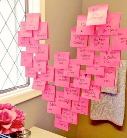 It feels sweet and deeply personal, like a quiet reminder of love left where it can be seen every day. Bright pink sticky notes form a heart across the wall, each one carrying a handwritten message that feels thoughtful and sincere. Soft daylight spills in from the nearby window, warming the space and giving the notes a gentle, comforting glow.