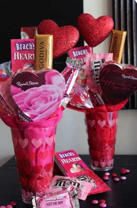 It feels festive and indulgent, like a Valentine’s surprise that’s impossible to ignore. Two clear cups are packed with chocolates and sweets, wrapped in layers of red and pink cellophane covered in tiny hearts. Glittery red heart picks rise above the treats, adding sparkle and height, while the colorful candy wrappers bring in shine and playful contrast.