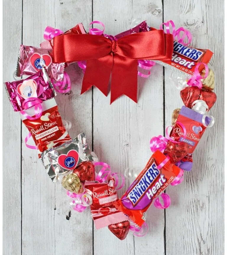 At the top, a bold red satin bow pulls everything together, instantly drawing the eye. The mix of heart-shaped chocolates and familiar candy bars adds texture and variety, making the wreath feel generous and thoughtfully made. It’s fun, romantic, and inviting, the kind of Valentine’s surprise that feels just as joyful to look at as it is to receive.