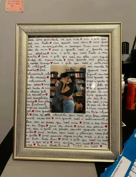 It feels quietly emotional, like a keepsake made to hold something real. A framed piece sits on a lived-in tabletop, its reflective edges catching the light. Inside, handwritten words fill the background from edge to edge, broken gently by small red hearts. At the center, a photo of a couple holding each other draws you in, their closeness feeling intimate and unguarded.