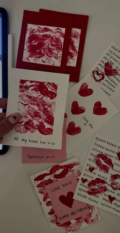 It feels creative and heartfelt, like a quiet moment turned into something tangible. Small cards are scattered across the surface, each marked with bold red lipstick prints and painted hearts. The deep reds pop against soft pinks and whites, giving the scene a playful, intimate energy that feels personal rather than staged.
