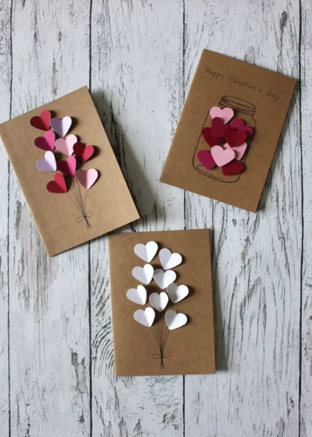 It feels soft and handmade, like a quiet Valentine’s gesture made with care. Three kraft paper cards rest on a gently weathered wooden surface, each decorated with tiny paper hearts in pink, red, and white. The natural brown paper and simple heart shapes give everything a warm, personal feel.