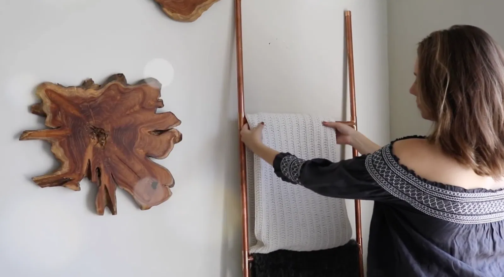 Save space with a copper towel or blanket ladder.