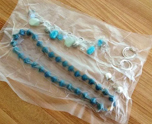 You can also sandwich your jewelry between two pieces of Press ’N Seal wrap. Just seal around the edges and roll it up, everything stays flat, secure, and totally tangle-free.