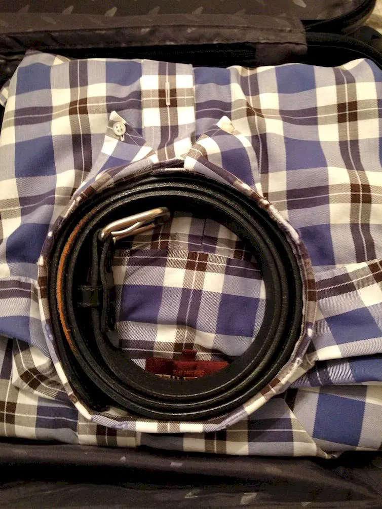 This is such a smart packing trick. Slide your belts inside your shirt collars before packing them in your suitcase.