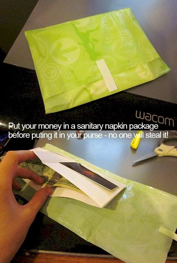 As a woman, I know most people don’t want to fiddle around with a sanitary napkin. It’s easy to hide money or other important documents in there, just don’t let anyone take your purse!
