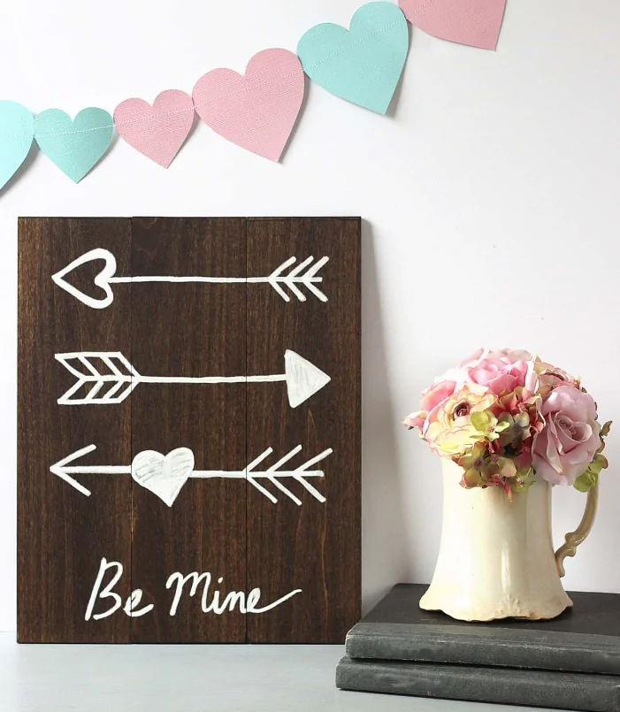 A dark wooden sign with simple white arrows and a handwritten Be Mine message sets the mood.