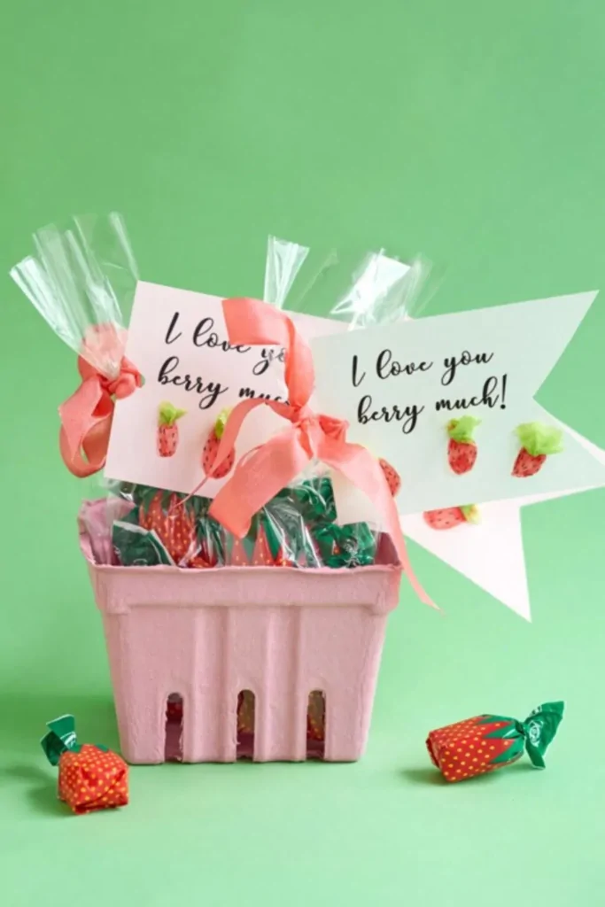 A soft pink basket holds little strawberry treats, all tied up with a gentle ribbon.