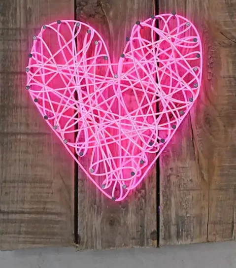Bright pink string weaves back and forth, creating a soft, tangled heart shape.