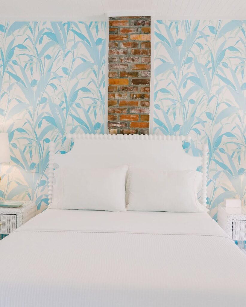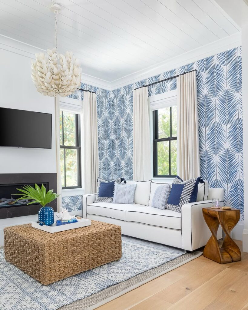 Blue palm wallpaper instantly brings a breezy coastal mood to the space. The flowing pattern adds movement and depth while still feeling light and refreshing.