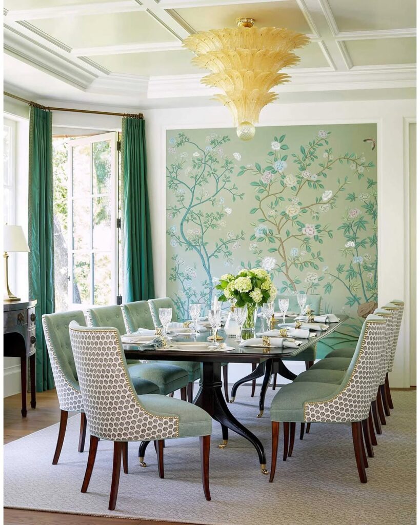 Detailed floral and vine patterns bring a fresh, natural energy that makes the space feel calm yet elevated. Soft green tones blend effortlessly with upholstered dining chairs and rich green drapes, creating a look that feels thoughtfully coordinated.