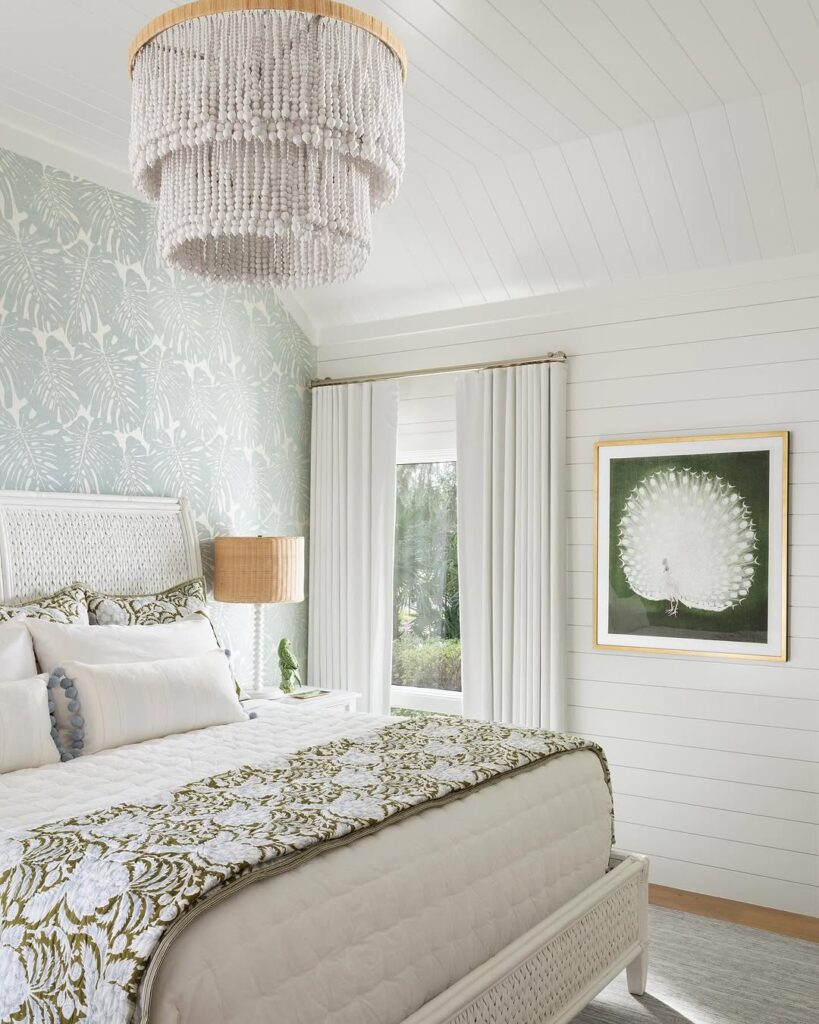 What makes this space shine is how balanced it feels. Natural textures like a woven lamp or beaded chandelier add depth while letting the wallpaper stay calm and understated.