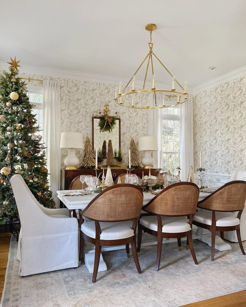 Muted floral tones pair beautifully with classic wooden furniture, creating a timeless look that never feels forced. Add a touch of glow with a gold chandelier, and seasonal decor like a Christmas tree fits right in without clashing.