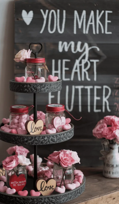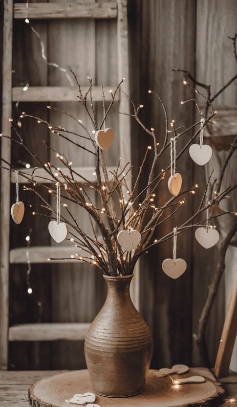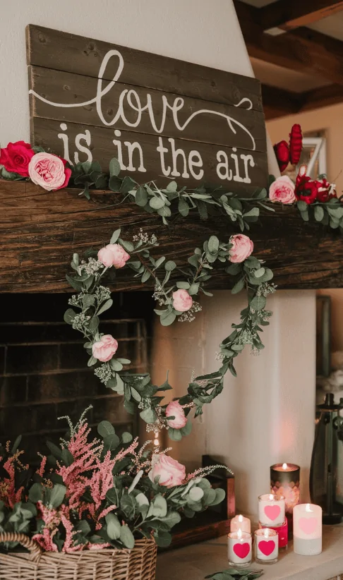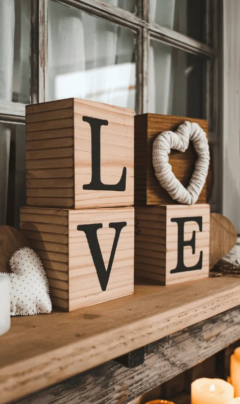 Layer rustic pieces like wooden signs, heart garlands, and soft candles.