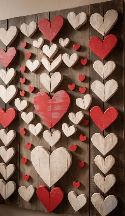Arrange wooden hearts in different sizes on a large canvas or directly on the wall.