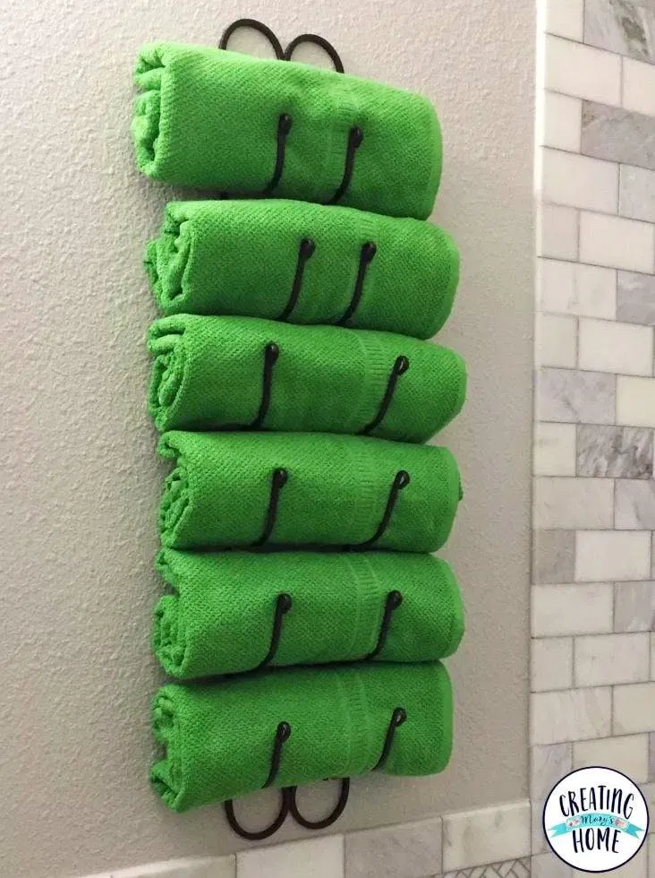 5. Displaying towels on a wine rack not only makes them accessible for anyone who might need one, but also clears up much-needed space in your linen closet.