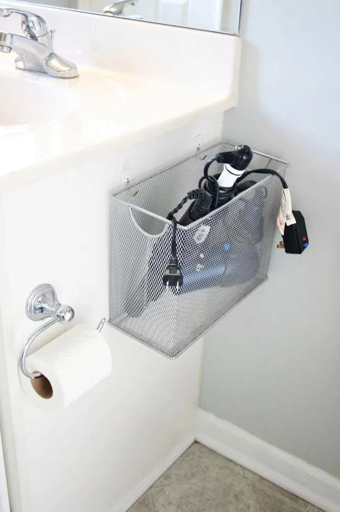 That is why this clever solution caught my attention. Dream Green DIY took a simple metal file bin and attached it to the side of her vanity with Command Hooks. Nothing complicated. No tools. Just instant, extra storage right where she needed it.