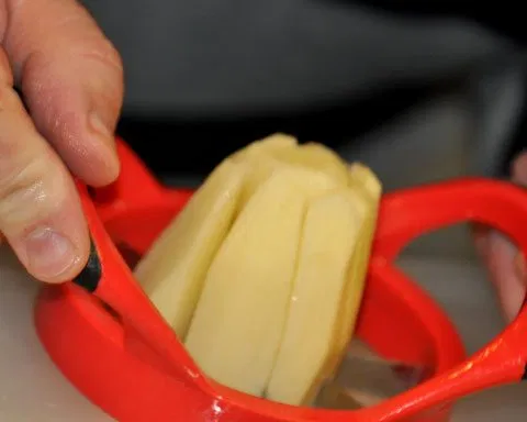 Here’s the shortcut: use an apple slicer instead. One press and you’ve got evenly cut pieces in seconds. Fast, satisfying, and a total game-changer for meal prep.