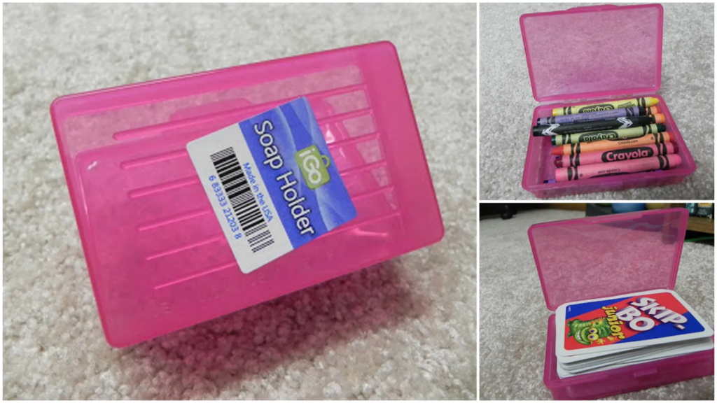 Dollar store soap containers are perfect for holding small things like playing cards, crayons, or toy accessories. They’re compact, easy to stack, and make staying organized feel way less overwhelming.