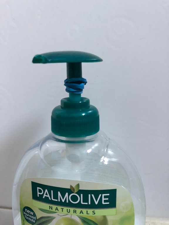 This is such a smart little tweak. Just wrap an elastic band around the base of the soap pump.