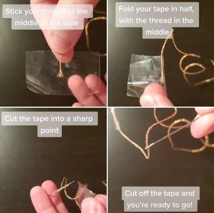 Just be sure the taped end is thin enough to fit through the eye. With this quick fix, threading a needle becomes much easier.
