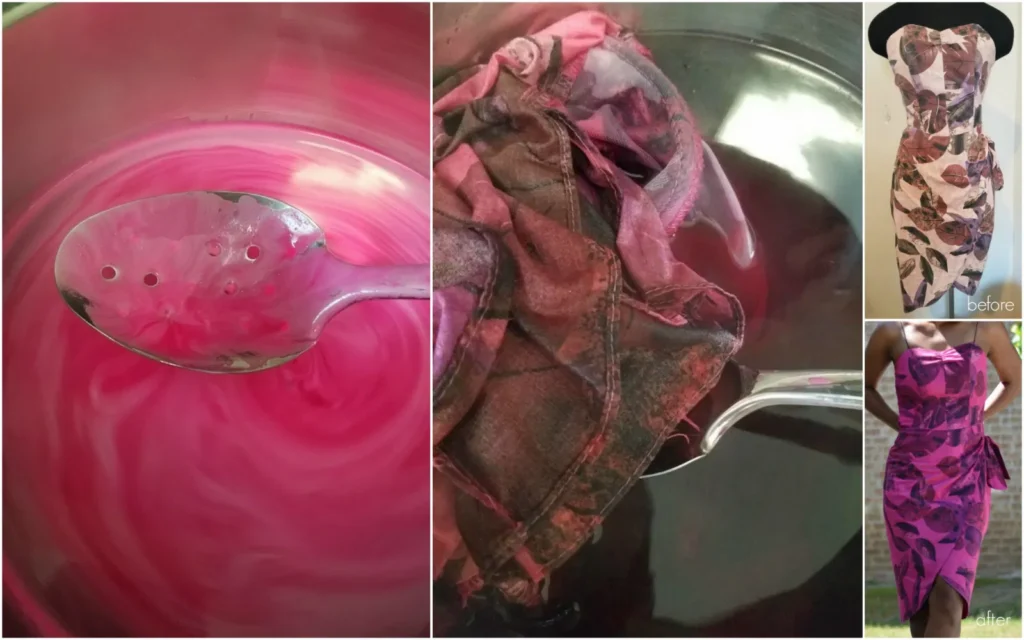 A faded dress with a tired fall foliage print gets a whole new life with just pink fabric dye and a stovetop.