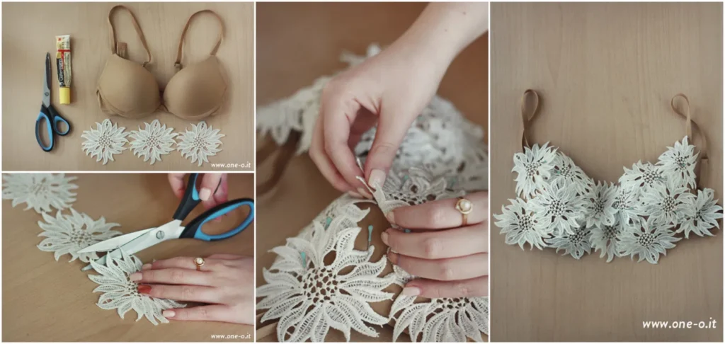 Using an old bra and delicate appliques, this lacey top turns something forgotten into something daring and beautiful.