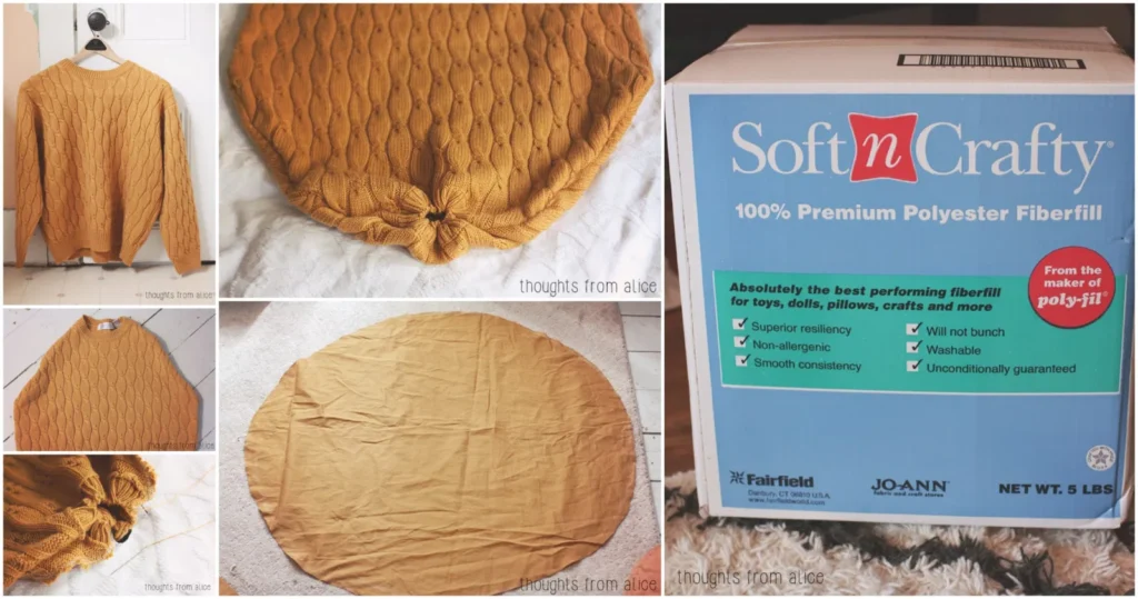 Another cozy way to upcycle an old or thrifted sweater is to turn it into a floor pouf.