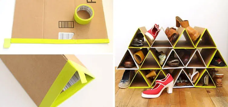 DIYer Ananda from A Piece of Rainbow shows how to turn heavy cardboard and tape into a clever geometric shoe rack.