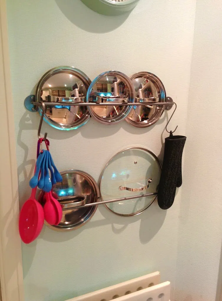 Towel racks and S-hooks are perfect for bulky items like pot lids.