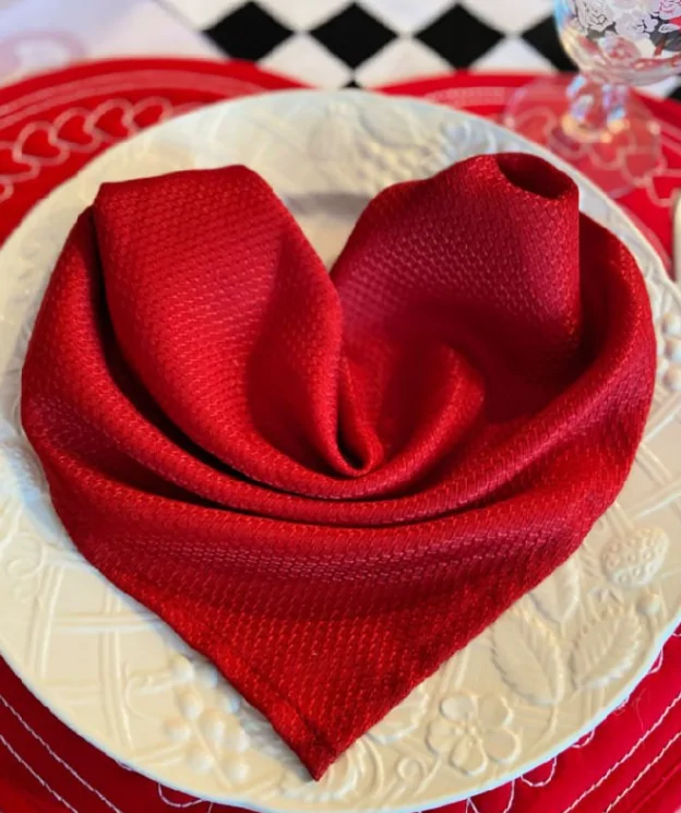 Add a fun and charming detail to your table with DIY heart shaped napkin holders. Start by folding red or pink napkins into a neat square, then tie them together with ribbon or twine shaped like a heart.